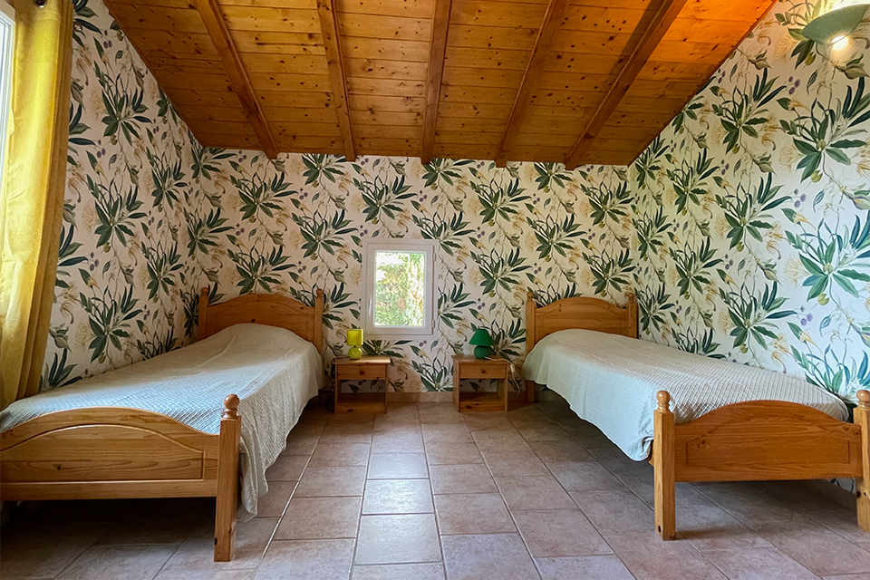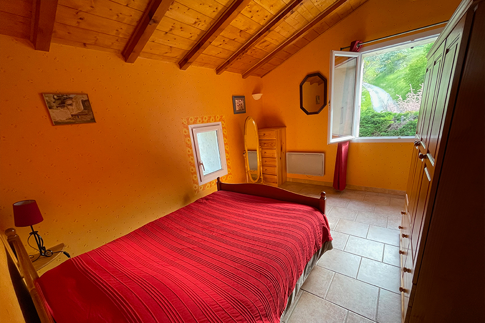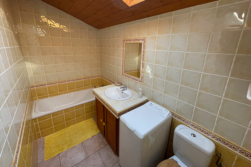 À l’étage, vous trouverez le coin nuit avec deux chambres : une chambre parentale et une chambre pour enfants ainsi qu’une salle de bain avec baignoire.