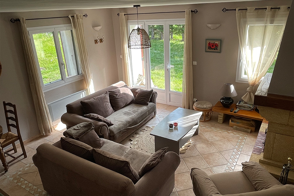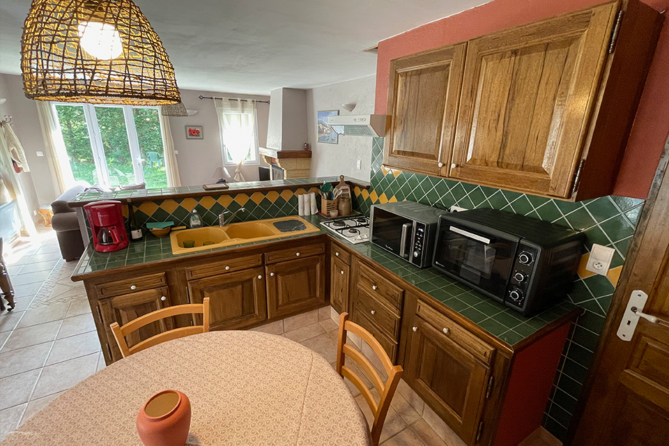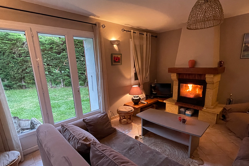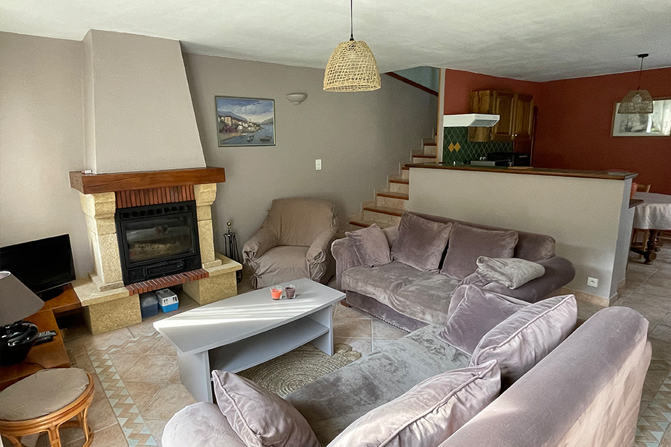 Vous trouverez au rez-de-chaussée la pièce à vivre avec une cuisine ouverte sur le salon. Une cheminée avec insert s’y trouve et donne à la pièce tout son charme.
